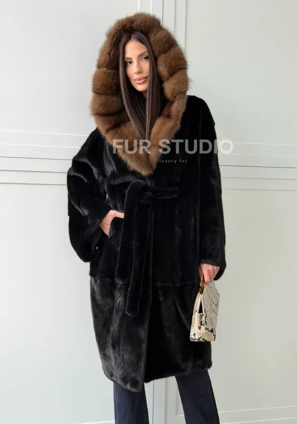 Норковая шуба фасон баллон с капюшоном куница 100518