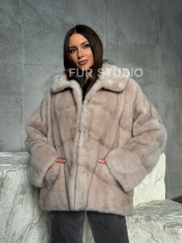 Норковый полушубок с капюшоном в цвете пудра 102512