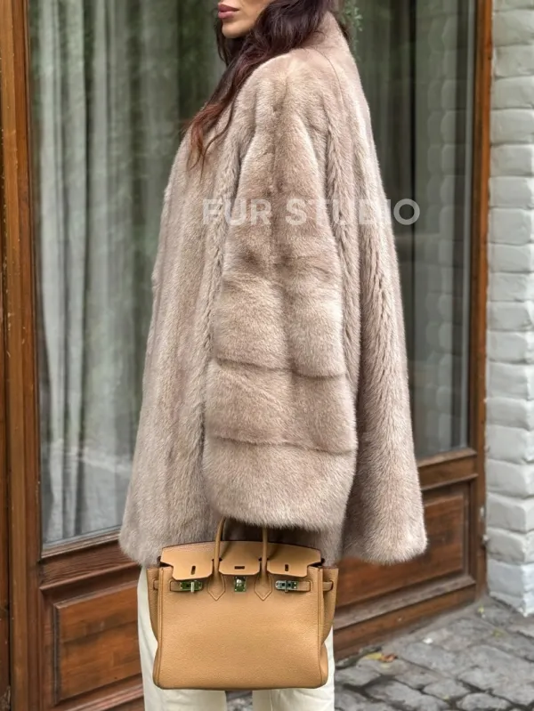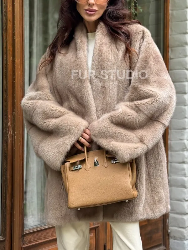 Мех данной шубы аукционная норка, цвет бежевый. Предлагается в размерах от 42 до 54. Длина модели 75-80 см, что выгодно подчеркивает фигуру девушек. Эта модель идеально подойдет для девушек и женщин, предпочитающих роскошные натуральные меха.