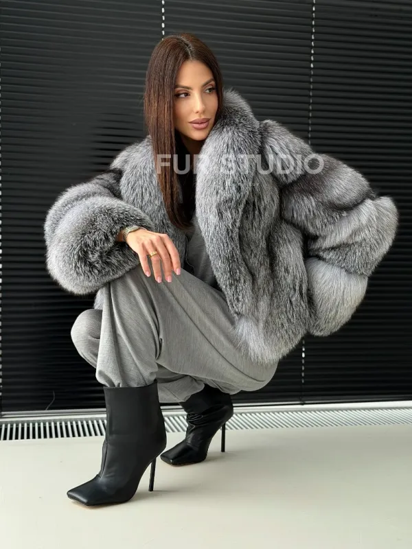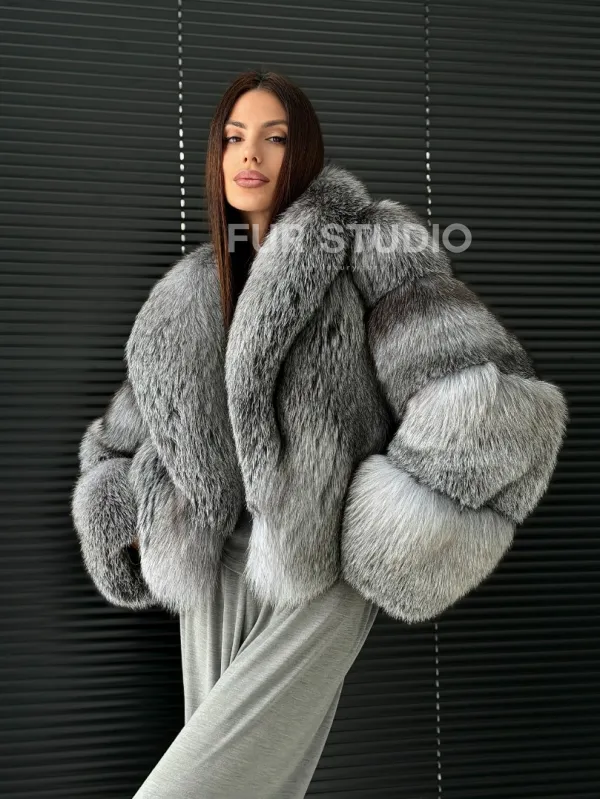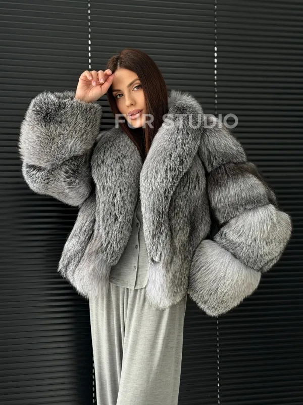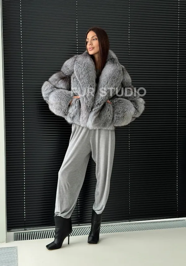 Мех данной шубы лиса, цвет серый. Предлагается в размерах от 42 до 50. Длина модели 50-55 см, что выгодно подчеркивает фигуру девушек. Эта модель идеально подойдет для девушек и женщин, предпочитающих роскошные натуральные меха.