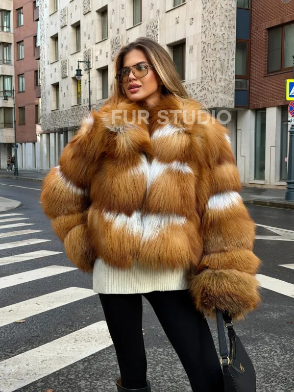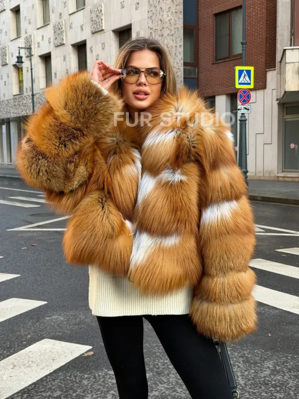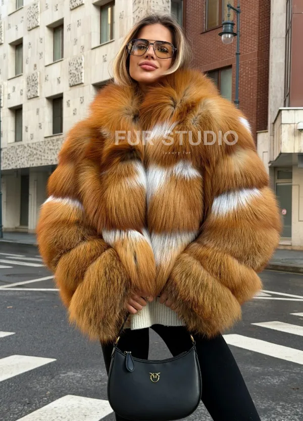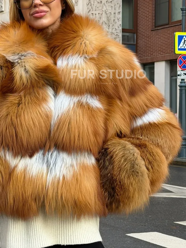 Мех данной шубы лиса, цвет рыжий. Предлагается в размерах от 42 до 46. Длина модели 50-55 см, что выгодно подчеркивает фигуру девушек. Эта модель идеально подойдет для девушек и женщин, предпочитающих роскошные натуральные меха.