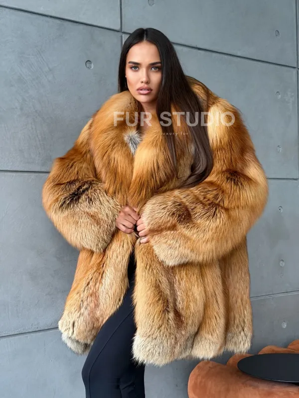 Мех данной шубы лиса, цвет рыжий. Предлагается в размерах от 40 до 52. Длина модели 80-85 см, что выгодно подчеркивает фигуру девушек. Эта модель идеально подойдет для девушек и женщин, предпочитающих роскошные натуральные меха.