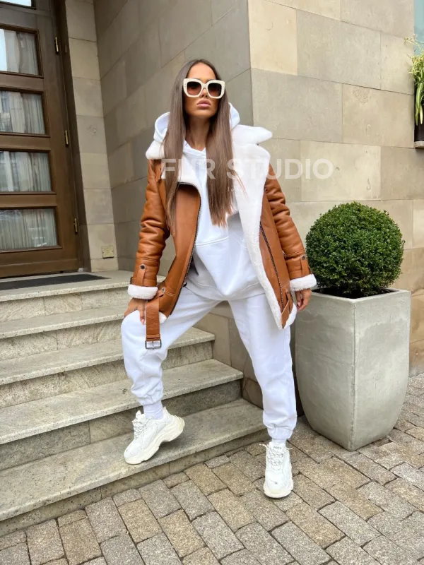 Женская дубленка авиатор в цвете виски – выбор современных девушек. Модель авиатор хит этого года. В дубленке будете выглядеть стильно и ярко вне зависимости от времени года. Яркая расцветка отлично гармонирует с любым цветом волос. Теплая подкладка позаботится о том, чтобы владелица не замерзла в сильные холода. Шикарный воротник подчеркнет изгибы шеи и согреет ее от непогоды.